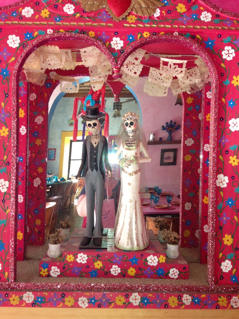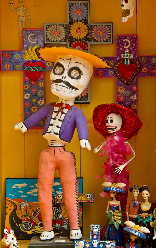The photograph above is of a fanciful piece of folk art colorfully on display in San Jose del Cabo. The artist who created these figures is very popular, and his pieces highly collectible. The Bride and Groom are also very common images for Day of the Dead as they symbolize Amor Eterno… Going well beyond “‘til death do us part!”